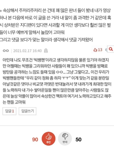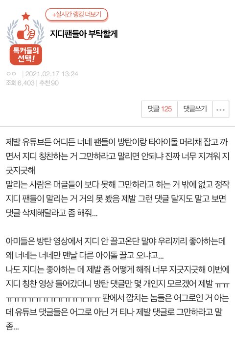 타돌 언급은 미안 ㅠ 근데 이거는 팬톡에 있는 모든 빂들이 알아줬으면 해서 쓰는 거야.. 참고로 지금은 글쓴이가 어그로 끌릴 거 같아서 지워줬어 저 글쓴이 말처럼 지금부터라도 조금씩 댓 정화하자 댓 싫어요 누르기, 까는 댓에 삭제 요청하기, 동조하지 않기 정도 하면 될 거 같아 직접적으로 댓 달기 힘들면 싫어요라도 눌러줘! 싫어요가 많으면 그 댓이 내려간다고 해 ㅎㅎ 그리고 요즘들어 타돌이랑 지디랑 엮는 어그로성 글이 많은데 먹금 잘 하자