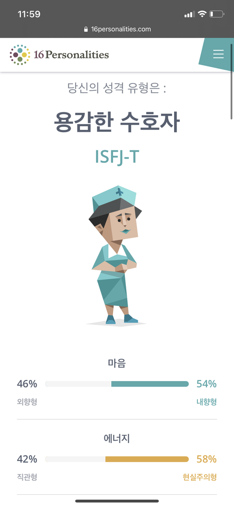 작년에 첨할때 infp나오고 두번째엔 infj나오고 방금 해보니까 isfj나옴.. 뭐징