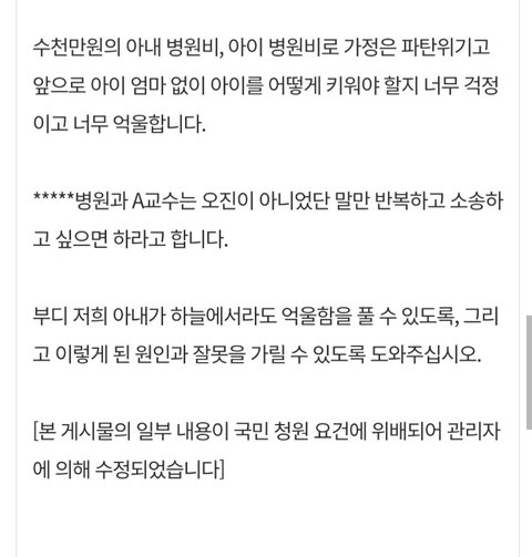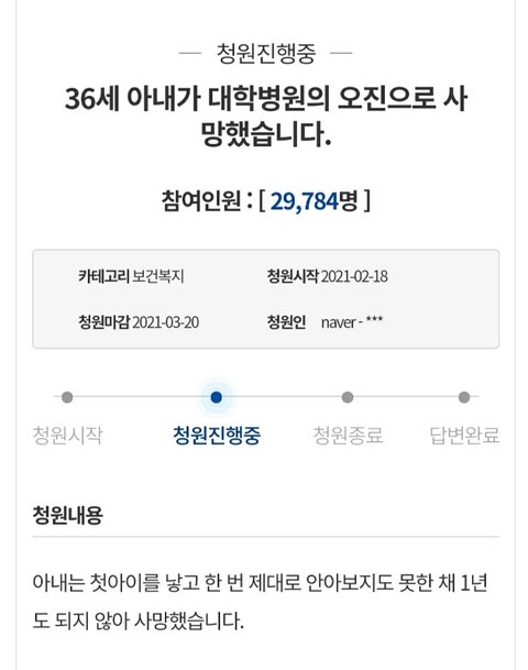 그렇게 아내분은 2021년 1월 14일 사망하셨고, 수천만원의 아내분의 병원비, 아이의 병원비로 가정은 파탄위기이며 해당 병원의 의사는 본인은 오진이 아니었다는 말만 반복하며 소송할테면 하라고 한답니다..