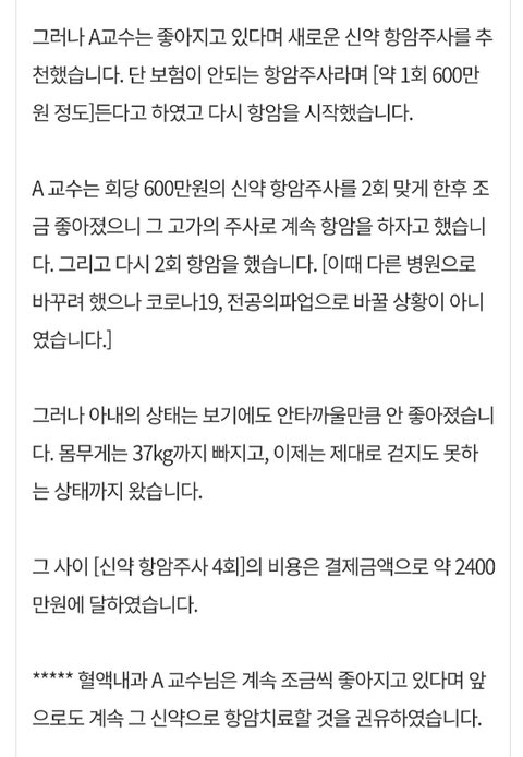 항암주사를 맞은 후에도 아내분의 증상은 별로 나아지지 않는 것 같았지만 병원의 의사는 좋아지고 있다며 보험이 안되는 신약 항암주사를 추천했고 [한 회당 600만원] 총 네 번 주사를 맞으셨다고 합니다.