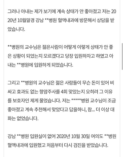 청원을 올리신 분의 아내분은 아이를 출산하신 뒤 몸이 안 좋아지셔서 병원에서 입원 검사 결과 혈액암 진단을 받으셨다고 합니다.
