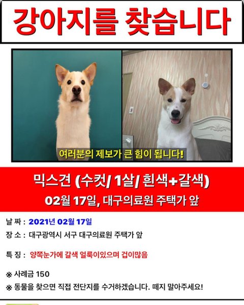 2021년 2월 17일 오전11시경 , 대구의료원 (대구광역시 서구 중리동) 부근에서 장군이가 실종됐어요. 장군이는 겁이 많아서 혹여 발견하거든 잡으려고 하지마시고 간식이나 이름을 불러 붙잡아주세요!