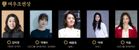 이날 여우조연상 후보에는 김미경(영화 ‘82년생 김지영’), 박혜수(영화 ‘삼진그룹 영어토익반’), 배종옥(영화 ‘결백’), 이레(영화 ‘반도’), 이솜(영화 ‘삼진그룹 영어토익반’)이 올랐는데