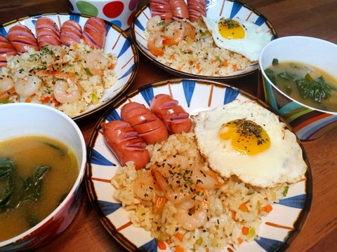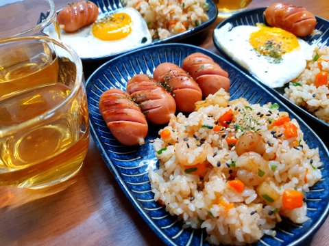 새우볶음밥,비엔나구이,계란후라이,사과즙