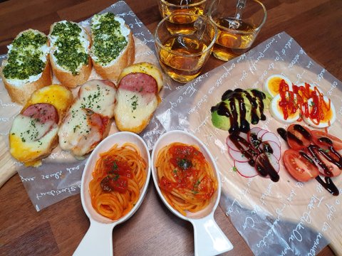 바게트토스트, 토마토스파게티,사과즙...외 몇가지
