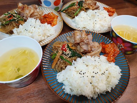 콩나물국,잡채,대패삼겹살,김치