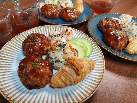 직접만든 함박스테이크, 생지로 구운 크로와상, 야채볶음밥, 아보카도