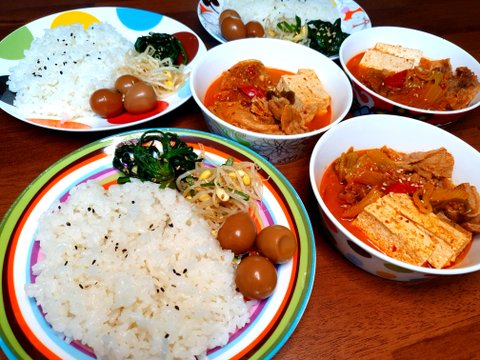 시금치무침,콩나물무침,메추리알조림, 돼지고기김치찌개