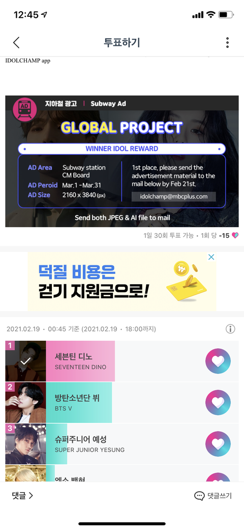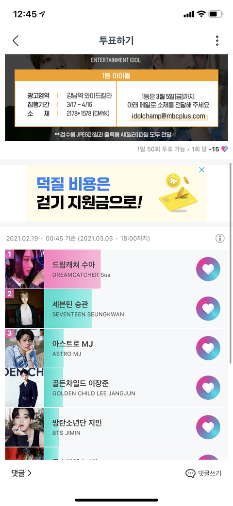 캐럿들 아챔 간당간당ㅎㅐ 투표 좀 해주라