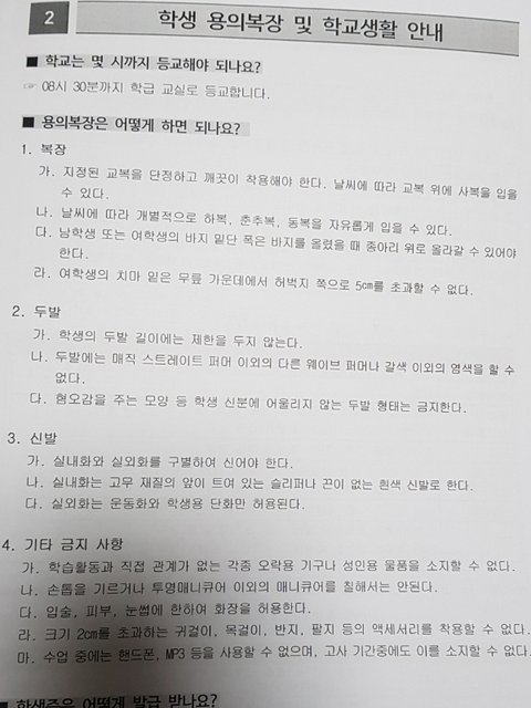 치마 길이는 무릎 위 5cm까지만 허용이고 통 줄이는 건 별로 뭐라 안함(근데 애들 중 3분의 1 정도는 무르퓌 10cm 이상으로 줄여댐)