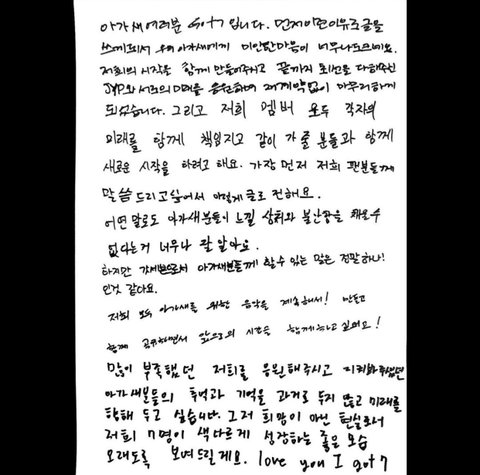많은사람들이 재계약 안해서 해ㅊㅔ라고 오해하지만 그거 아니구~~ 멤버들이 꾸준히 컴백할거라고 불안해하지말라고 말해주고있음!! 어제 잭슨 피셜로 잭슨,영재,JB.유겸 다 곡작업 중이라고 스포함ㅎㅎㅎㅎㅎㅎ