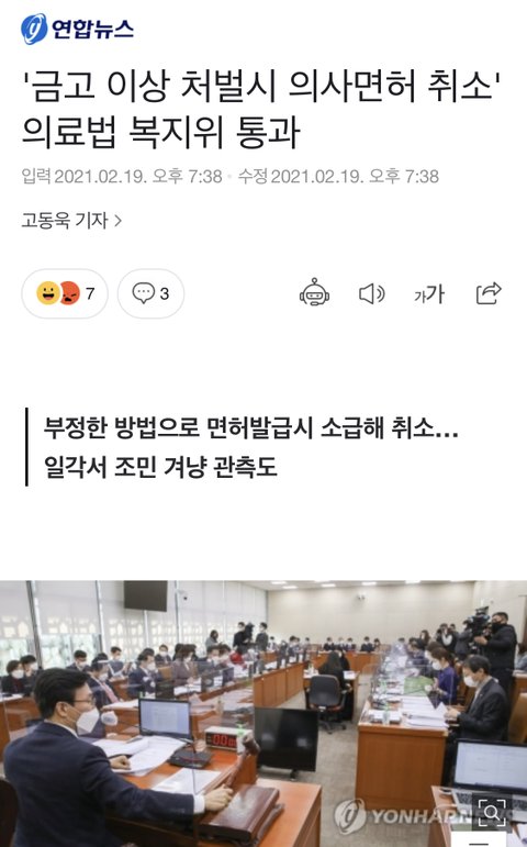 안녕하세요. 현재 정부가 의료법 개정안을 사람들의 관심이 사라졌을 때 몰래 통과시켰습니다. 금고형 이상의 형을 받으면 의사면허가 취소되는 것이 내용인데요. 물론 범죄를 저지른 것은 잘못된 것이지만, 그로 인해서 생계가 끊기는 것은 심각한 문제입니다. 게다가 잘못된 재판을 받아서 형이 취소되어도 다시 면허를 발급해준다는 조항은 어디에도 없습니다. 이는 의사에 대한 정부의 보복입니다. 대한의사협회는 백신 접종 보이콧과 총파업을 단행할 것입니다. 곧 국민청원이 올라올 예정이니 국민들의 건강과 관련된 의사들에 대한 보복을 막아주세요. 감사합니다.