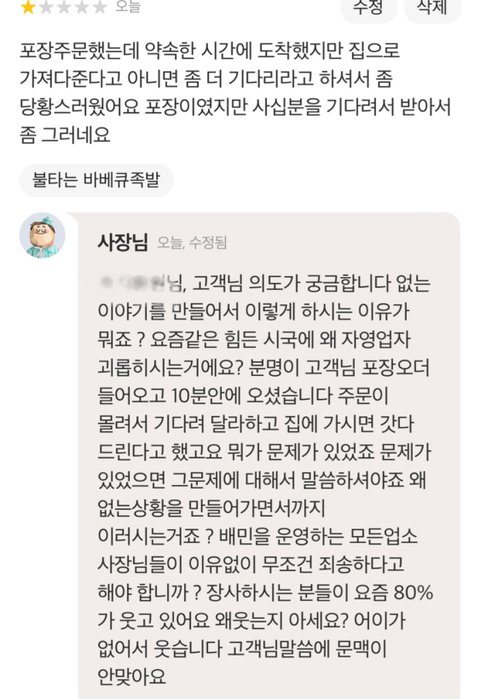 6시 23분에 주문을했고 20분 이내에 오라고 하셔서 근처 슈퍼에 40분쯤 들리고 족*슈*에 들렸죠 한 오분 넘게 기다리고 있는데 십분 넘게 걸릴 것 같으니 더 기다리시거나 아니면 집에 가져다준다고 하셔서 (집까지 5분거리) 조금 짜증낫지만 그냥 집에 가져다달라고 했습니다 그런데 저희는 7시 넘어서 음식을 받았어요 그래서 별점 1점과 저희가 기분 나빳던 점에 대해 리뷰를 남겼어요. 그러니까 거기서 다시 댓글을 달았는데 저희한테 없는말 지어내지말라며 요즘 같은 어려운 시기에 자영업자들을 왜 괴롭히냐는 겁니다.. 그래서 전화를 하니 진심없는 사과와 리뷰를 다지우자고 하더라구요 .. 이럴 때 어떻게 해야하나요? 사진은 가려서 첨부하겠습니다. 제가 잘못한 부분이 있으면 솔직히게 댓글 남겨주세요! 저는 요즘 같은 힘든 시기에 자영업자들 괴롭히고자하는 것이 아닙니다 모든 자영업자들 화이팅입니다! ( 저희 부모님도 자영업 하십니다)