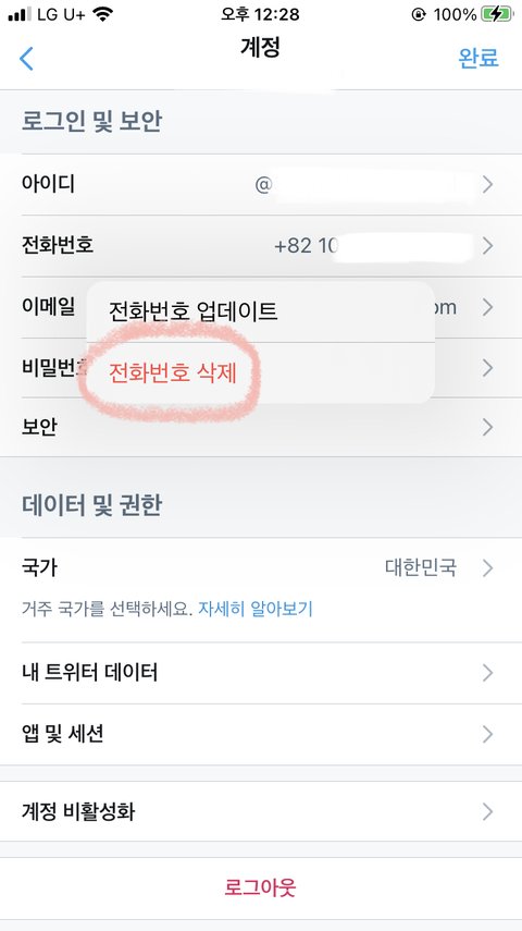 요기 사진처럼 전화번호 삭제를 꼭 눌러줘야 돼