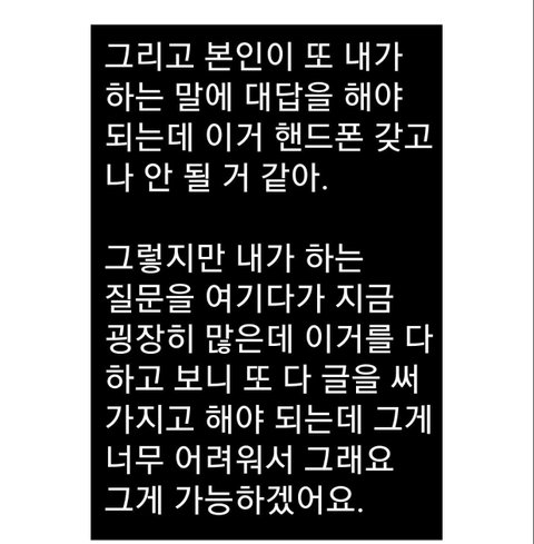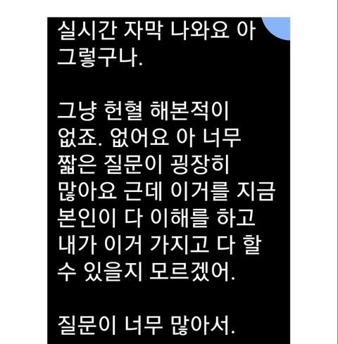 이 검은사진들은 실시간 자막 변환 어플을 통해 선생님과 대화했던 내용입니다. 실시간 자막 변환 어플은 상대방이 말하면 이게 자막으로 나오는데 제가 그걸 보고 대답합니다. (조금? 오타가 나오거나 놓치기도 합니다.)
