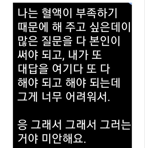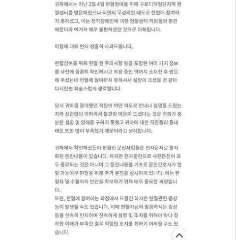 2월 4일날 정말 황당한 일을 당했습니다. 저는 그날 구청에 갔다가 집에 가는길에 헌혈의 집에 들렀습니다. 저는 그 당시에 어제 주의사항을 확인했고, 혹시 나도 가능하나 하는마음에 정기적으로 복용하고있는 약도 챙겨서 그 헌혈의 집에 갔어요. 그런데 헌혈의 집앞에 있던 여자 중년 간호사님께서 제가 청각중증장애가 있다고 얘기했더니 갑자기 표정이 어두워지곤 안될것같은데... 하고 중얼거리셨어요. 일단 그 간호사님께서 저를 데리고 어느 선생님께 데려가셨어요.