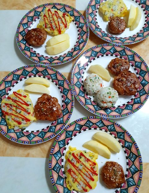 수제함박스테이크, 계란그물밥(볶음밥과 계란), 사과