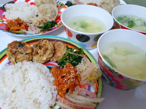 수제동그랑땡,수제만두,시금치무침,볶음김치