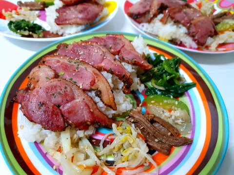 훈제오리구이, 감자볶음,숙주나물,