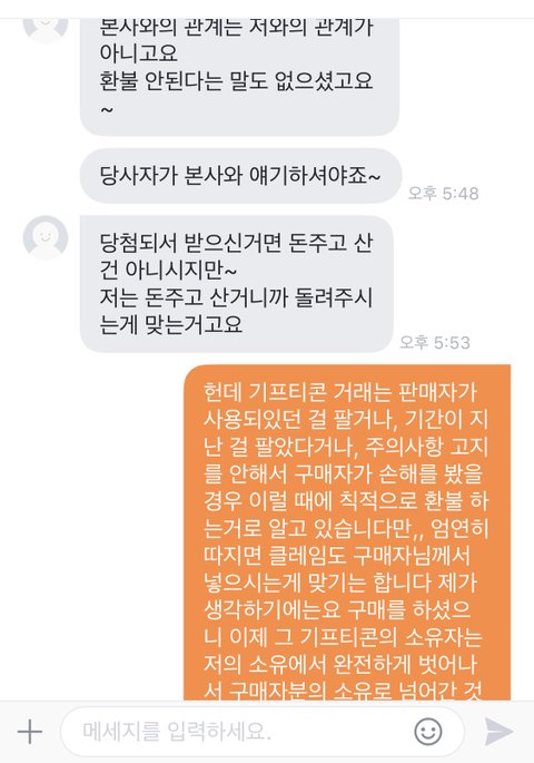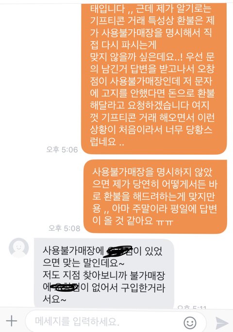 -쓰니가 기프티콘 거래하면서 환불 요청 받은 적 한번도 없었으며, 사용불가매장과 주의사항을 명백하게 고지했으므로 환불 해드려야 하는 의무는 아닌 것 같다고 말함