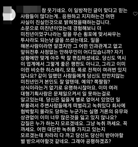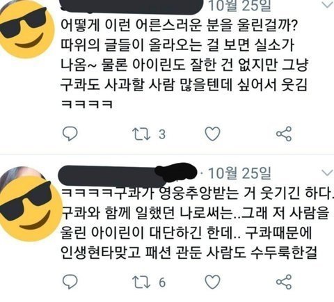 이후로 60~70명정도 관계자들이 아이린 쉴드쳐줬고 에디터 이후 추가폭로들은 다 바람잡는 가계정들인걸로 밝혀짐더블퍠티 스태프 사칭한 인별계정도주작...