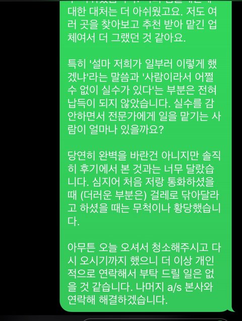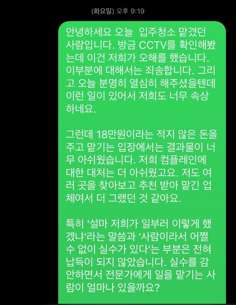 전화로 청소가 제대로 되어 있지 않다고 말씀드렸음. 근데 돌아오는 대답은 이게 사람이 하는 일이다 보니 실수가 있을 수 밖에 없다