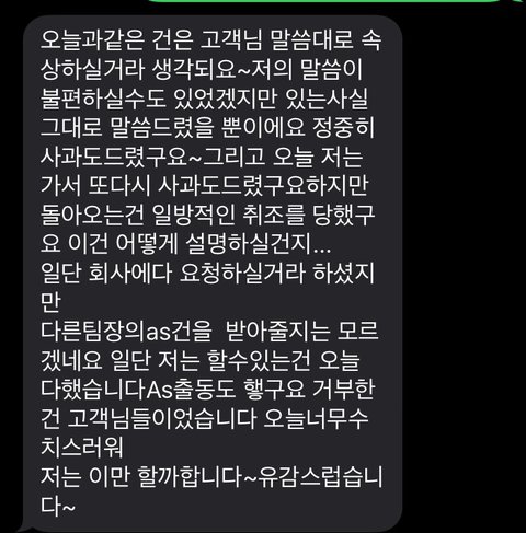 팀장 : 어제 A/S 나갔는데 거절한 건 고객님이고 저는 청소가 미흡했던 점에 사과했고