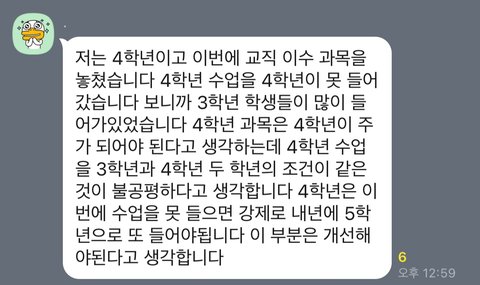 물론 수강신청은 선착순이 원칙이고, 일차적으로 이를 따라하는 것이 맞습니다. 하지만 4학년 필수 과목의 인원수를 올해 수업을 듣는 4학년 학생 수보다 적게 만들어 4학년 학생 중 몇 명은 어쩔 수 없이 필수 과목을 못 듣게 되는 상황입니다.