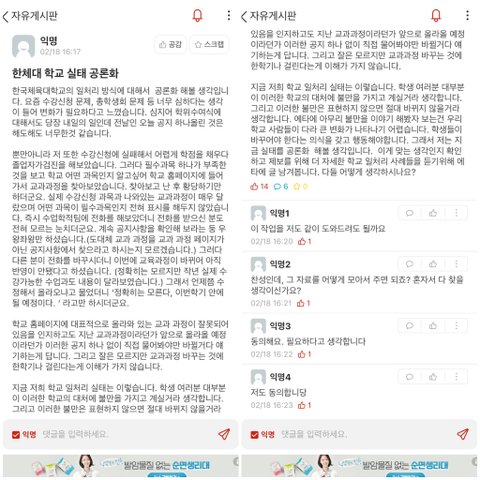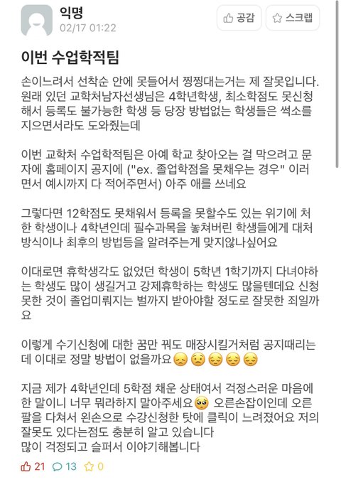 학교의 실태를 알리는 것이 부끄럽지만 앞으로 제가 다니고 졸업할 학교가 부끄러운 학교로 남는 것을 원하지 않아 바뀌길 바라며 이렇게 글을 쓰게 되었습니다. 긴 글 읽어주셔서 감서 드리고 이 글이 화제가 되어 학교에서 변화가 일어나길 바랍니다.