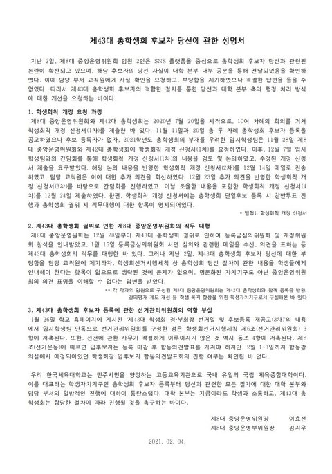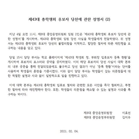 이후 논란이 일어난 것을 학교 측에서 인지한 후 학교 홈페이지에 제43대 학생회 정, 부회장 입후보자 등록 현황’이라며 글을 게시하였지만 성명서에 따르면 이미 해당 후보자의 당선 사실이 대학 본부의 내부 공문을 통해 전달되어 있었습니다. 다시말해 논란이 되자, 이미 당선이 내정된 사실을 숨기고 학우들에게 후보자라고 공지를 올린 것입니다. 이에 중앙운영위원회에서는 다시 성명서를 작성하여 올리고 학생들의 반발이 수그러들지 않자 학교는 이제야 입후보자 등록부터 입후보자 의견발표, 투표 일정에 관한 공지를 올렸습니다.