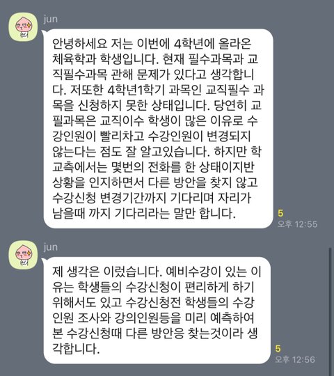 물론 수강신청은 선착순이 원칙이고, 일차적으로 이를 따라하는 것이 맞습니다. 하지만 4학년 필수 과목의 인원수를 올해 수업을 듣는 4학년 학생 수보다 적게 만들어 4학년 학생 중 몇 명은 어쩔 수 없이 필수 과목을 못 듣게 되는 상황입니다.