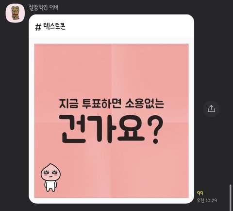 고독방 상황인데 다들 투표하는 것조차 모르고 있어 고독방 들어가있는 더비들 있으면 꼭 말해줘 그리고 주변에도 부탁 많이 하고 계정 만드는데 진심인 더비들은 팬톡 더비들밖에 없는 것 같아 팬톡 더비들 중에도 모르는 더비들이 있긴 하던데 다른 곳에 비하면 우리는 나은 편이야 우리 진짜 이 갈고 하자 더비들아 당장 내일이야