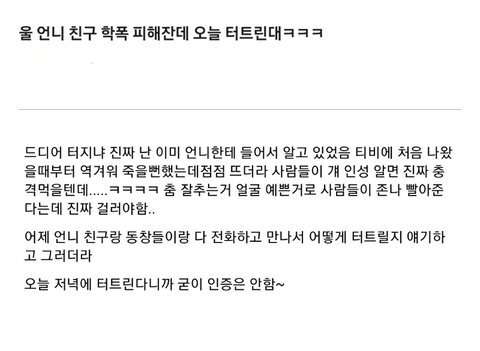어떤 커뮤에서 자기 언니가 학폭당했었다고 이따 저녁에 폭로한다 그랬거든 그 연예인 힌트는 그룹이었는데 이젠 솔로로 활동하고 있고 춤 잘춘대