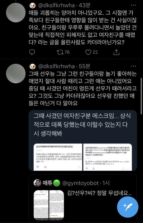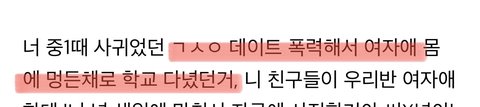 2. 김선우가 여자친구를 폭력하는 모습을 직접 목격한 것도 아니며, 여자친구한테 들은 얘기도 아님. 김선우 여자친구 몸에 멍이 있다는 이유로 김선우가 데이트 폭력을 했다고 본인이 추측한 것.