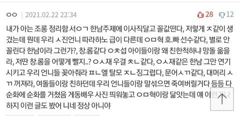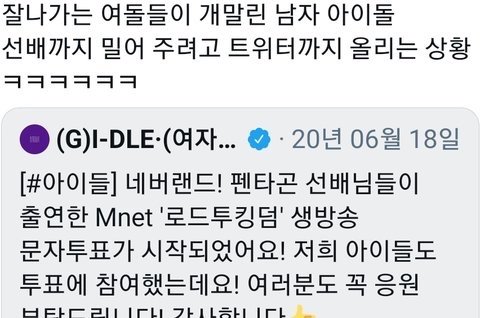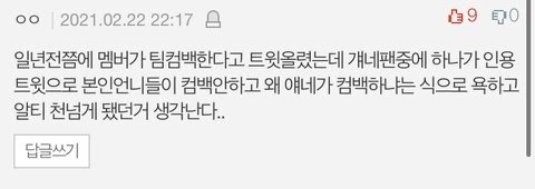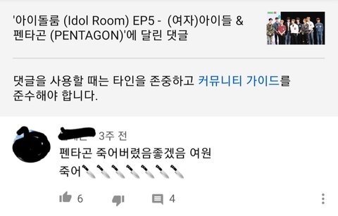 펜타곤 키노 생일이어서 옌안이랑 키노랑 둘이 브이라이브 하는데 ㅇㅇㄷ 팬이 인장 달고 들어옴 누구였는지도 기억함. 그런데 거기서 외모 비하 발언, 망돌 드립 침 멤버들이 육성으로 그거 읽어주고 본인들 자책함 내가 직접 봄.