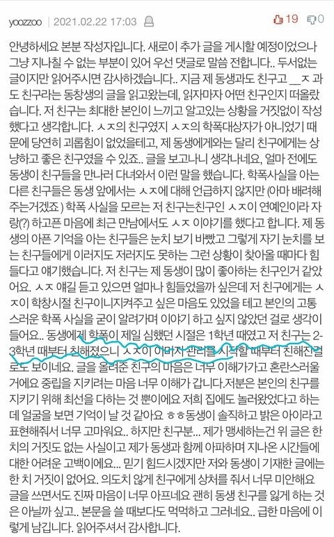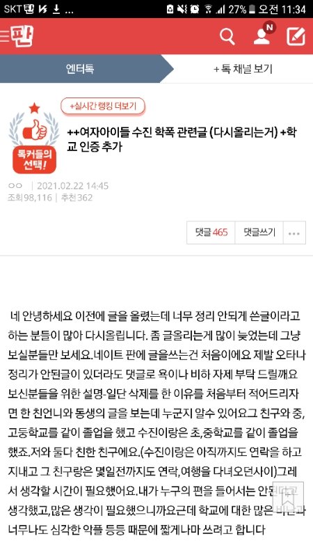 시작하기전에 난 아직 중립이야. 시녀도아니고 피해자옹호도아냐. 정확하게 팩트만 집고갈꺼야. 일단 피해자라하시는분은 증거가없으니까 국내법상 아직 피해자가 아니거든? 그래서 나도 다른 댓글들처럼 자칭피해자라할께. 일단 사진들은 다 자칭피해자 언니분인가가 쓰신글이야. 근데 중간에 말이 바뀌어. 이분 처음에는 2년내내 괴롭히다가 갑자기 자기미래준비한다 하셨다가 그다음글에서는 1학년때 제일 심했고 2학년부터 이미지관리를 시작했대. 맨 밑 사진은 다른 동창분이 인증하신 수진 쉴드글. 앞서 말했듯이 난 시녀도아니고 타돌팬인데 이슈 재밌어서 보다가 이상해서 글남겨. 그리고 제발 물증 없는거 똑같으면 한쪽말만 믿지말고 양쪽다 믿어줘 제발 니네 보고있으면 너무 답답해.. 이거보고 또 시녀드립칠것같긴한데 일단 뭐 이정도만할께 또 증거 올라오는거 있으면 수정할께!