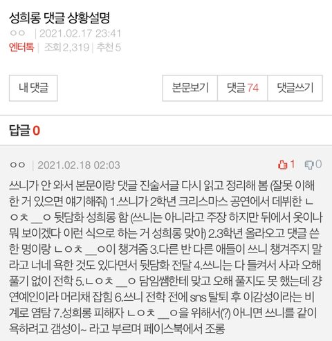저번에 ㅌㅇㅇ ㅊㅇㄱ 학폭 터졌을 때 피해자1이라고 주장한 애가 뒷담까고 성희롱 했던 거였고 오히려 피해자인 여돌 있었던 거 기억 함? 지금 판 분위기가 너무 다들 화 나있고 가해자들 욕 하고 이런 쪽으로 가있고 연예인 믿는 거 아니다 이러니까 갑자기 피해자였던 여돌 생각나네 기억 나는 사람 있냐 난 불쌍해서 좀 자주 찾아보는 중
