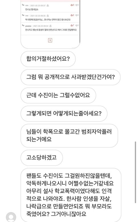 인스타 댓글 학폭 폭로자 입니다. 소속사측과의 연락