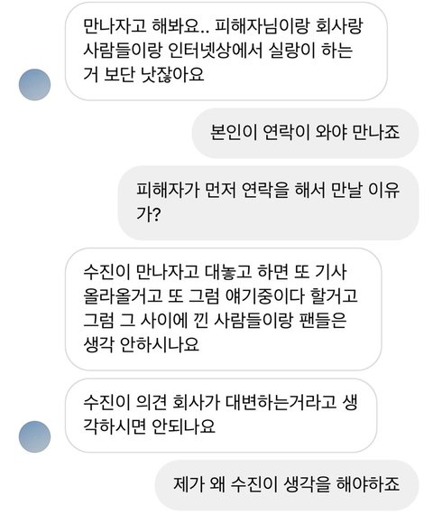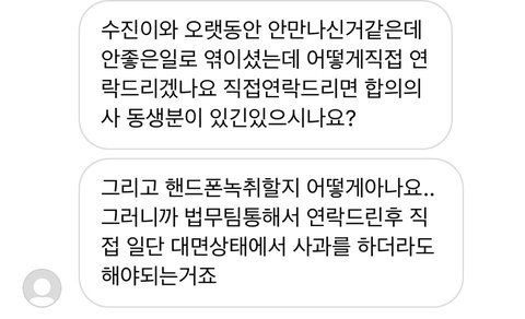 왜 동생과 소속사 법무 담당하시는 분들이 접촉하게 해야 하는지 참 이해가 안됐습니다.피해자와 만나고 싶다고는 하면서 가해자는 또 직접 나오나요?? 가해자 없이 대리인과 피해자만 만나면