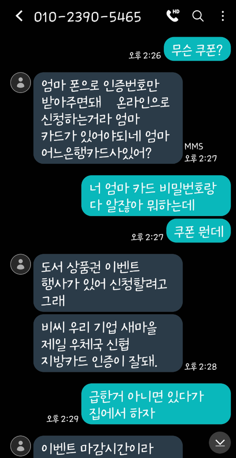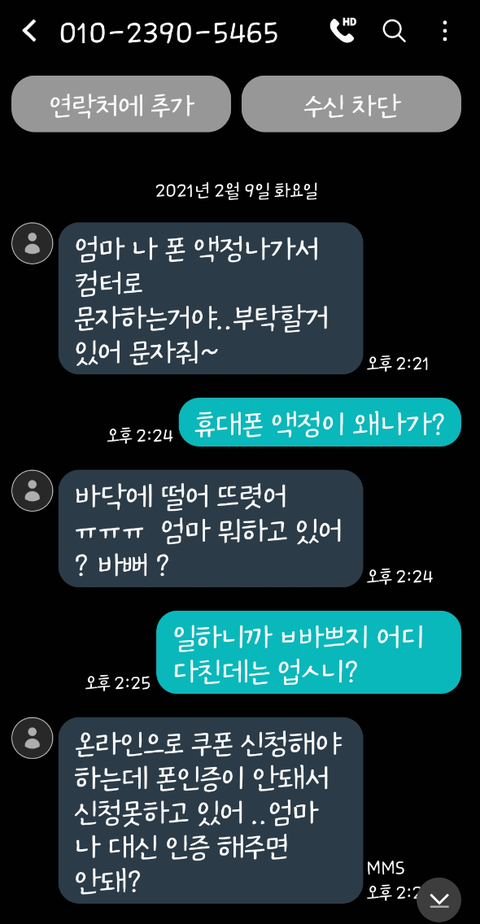 이러한 문자나 카톡을 받으시면 제발.. 자녀분께 먼저 전화나 문자로 확인하시길 간곡히 부탁드립니다..