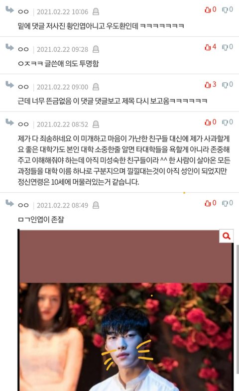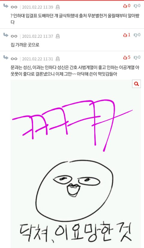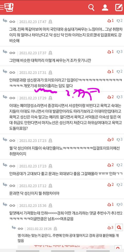 어제 서로 자기 대학이 좋다고 우기는데 몇몇애들이 거따대고 도토리 키재기라면서 그만싸우라고 하니까 성신여대 인하대생 화나서 막 욕하는거 웃겼는뎈ㅋㅋㅋㅋㅋㅋ 하도싸우니까 차은우미만잡~ 이러면서 쪼게고ㅋㅋㅋㅋ 밑에 사진에 나와있어 아까 못봤다는애들 봐봥