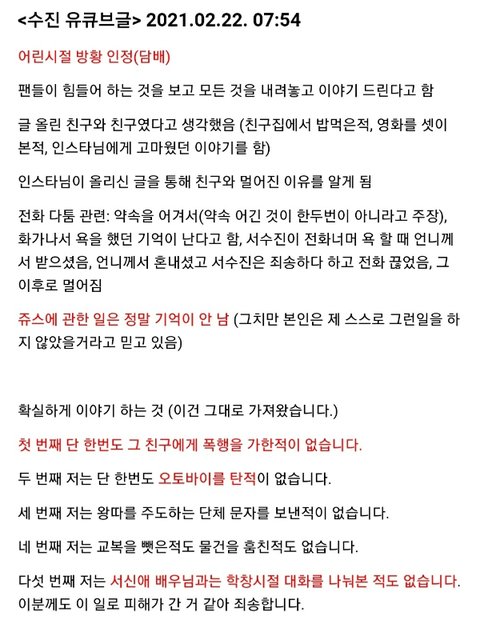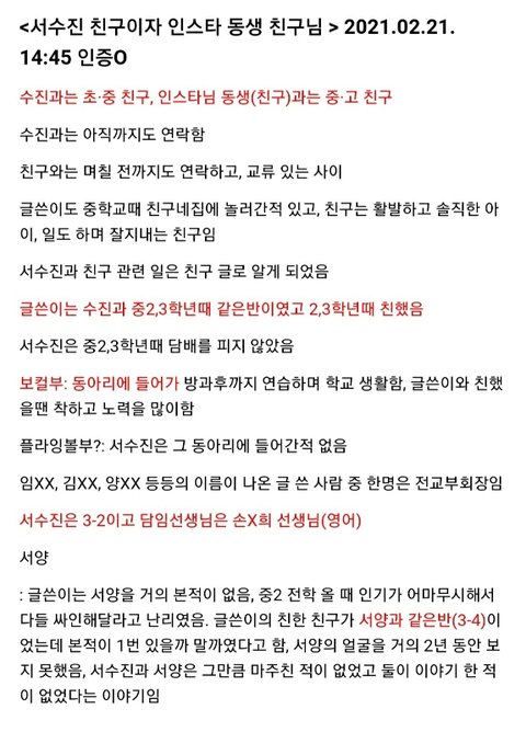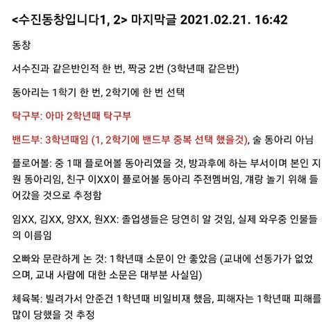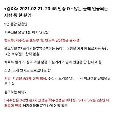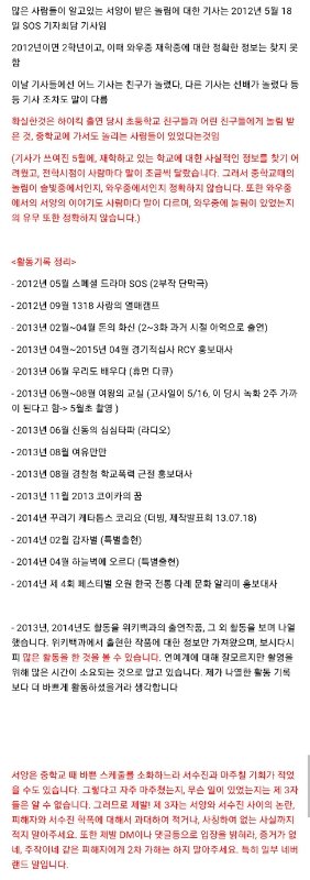 또한 제 요약들로 인해 피해자님들이 또 다른 상처는 받지 않아야 된다고 생각했습니다. 그래서 어제 저녁부터 지금까지 최대한 객관적으로 글을 요약하려고 노력하였습니다. 하지만 노력에도 불구하고 제 요약글을 읽은 것에도 상처가 되실 것 같아 죄송스럽기도 합니다. 우선 피해자분들의 학폭 관련일들은 적어두었지만 빨강 표시는 하지 않으려고 했고, 제 3자가 봤을때 객관적으로 보이는것들을 위주로 표시 하였습니다.