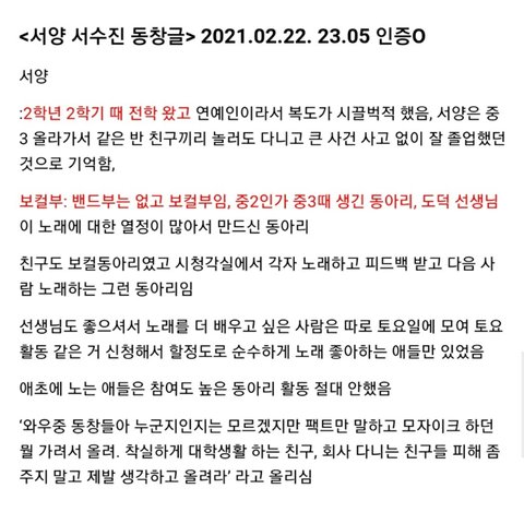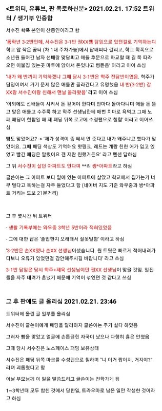 그래서 서수진의 공식적인 학폭 논란 후 주기적으로 판에 들어왔습니다. 그래서 많은 사람들의 학폭 폭로글과 폭로하는 댓글을 최대한 많이 봤습니다. 많은 분도 아시다시피 서수진 폭로글(극소수 쉴드글과 중립글)이 넘쳐났습니다.