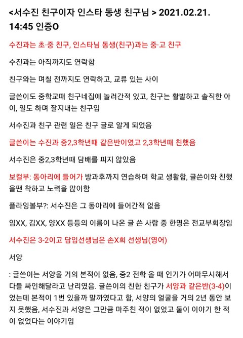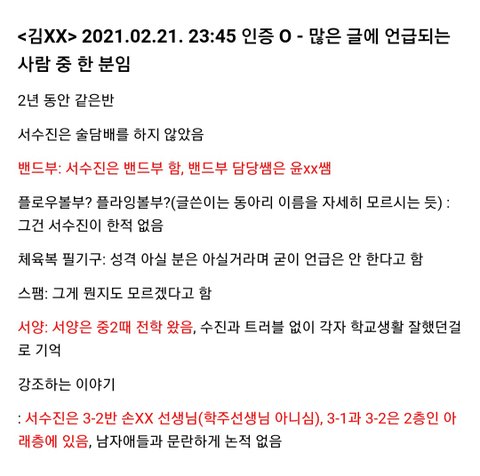 - 서수진은 2학년때 5반 (서수진 중2,3때 같은반 친구이자 인스타 동생님 친구 분의 기록부를 봤을때), 3학년때 2반 (이건 친구분 기록부 볼 필요없이 많은 사람들이 2반이라 말하였음, 기록부에도 2반이라 적혀있음)