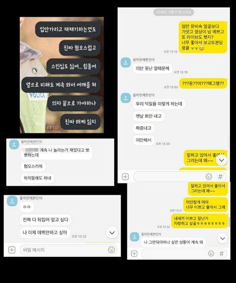 진짜 증거는 꼭 필요하다고 생각해요 ! 근데 몰래 카메라도 아니고 짜고 쳐서 하지 않는 이상 찍을 수도 없어서 괴롭힘 당하는 증거가 없어서 저 역시 답답했어요 .. 이보다 더 많은 증거자료들은 민아언니가 가지고 있어요