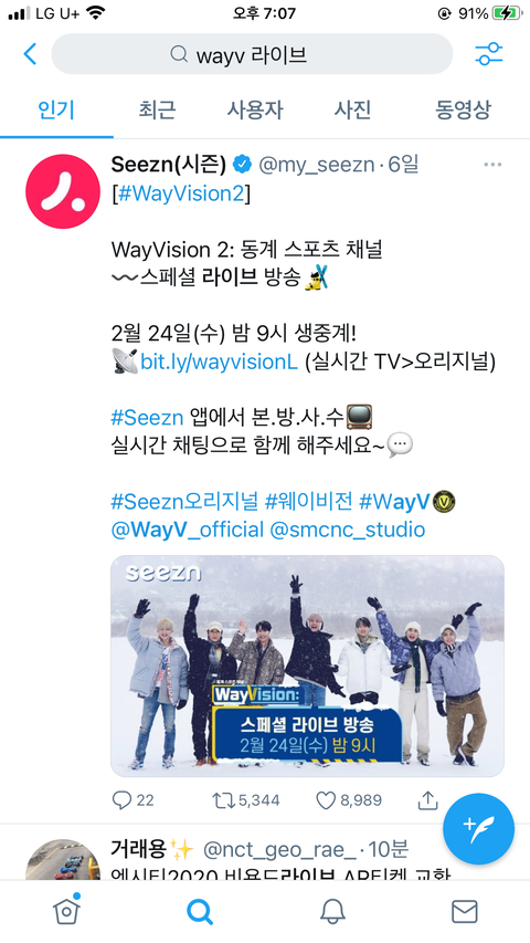 웨이션브이 오늘 저녁 9시에 시즌에서 라이브 한당!