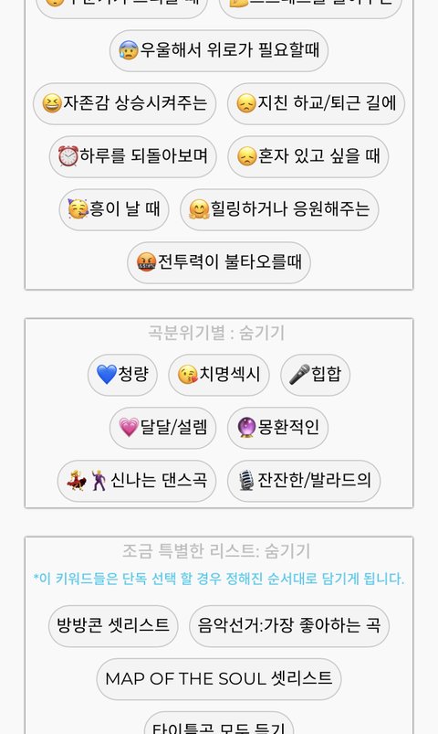 방탄 노래중에 원하는 느낌 곡들 있으면 우리 음가팀에서 만든 방플리 들어봐!! 아미들한테 직접 설문조사 해서 만든거라 ㄹㅇ 믿듣