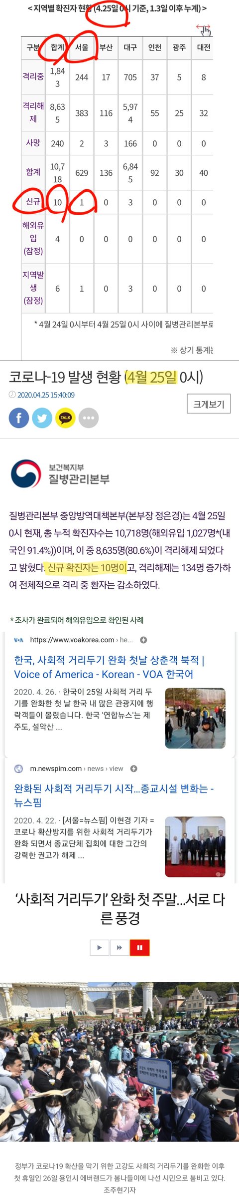 추반올려줘 4월 25일 전국확진자 10명 서울 1명 사회적 거리두기 0.5단계였고 4월 26일 에버랜드 입장객들 사진봐도 전국적으로 관광객 넘치고 사람들 밖으로 많이 돌아다녔음 근데 97즈가 신천지 클럽 슈퍼전파자랑 확진 아이돌들보다 몇백배로 욕먹은게 팩트지