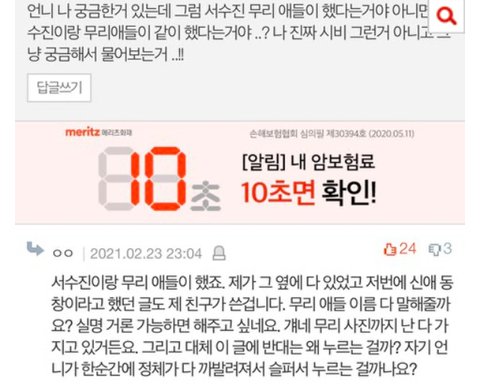 일단 한 댓글의 친구 이야기 "수진이가 담배를 서x애 서랍에 넣어두고 같이 했다"라는 주장