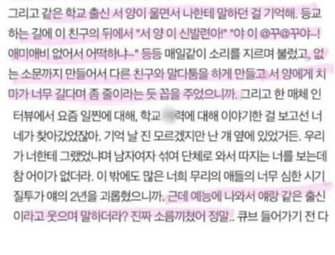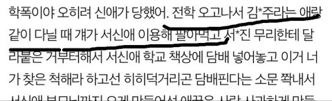 저는 그 무리랑 친한적도 같이 다닌적도 없습니다. 다시 한번 말하자면 제가 글을 쓴 이유는 피해자들의 대한 반박이 아니라 수진이가 서x애에게 그런 행동을 한 적이 없다는 것을 말하고 싶었습니다. 서x애 전학왔을 때 저랑 지냈으니 그 무리에서 방관을 한 적도 무리에서 그런 행동을 한 것을 보며 낄낄대며 웃은 적도 없는 것이 사실입니다. 이 글에서는 제가 알고 있는 한에서 허위와 과장에 대한 반박을 한 것이고 피해자 증언들에 대한 것을 저에게 질문하셔도 저는 대답을 할 수 없습니다. 이 글이 제가 알고 있는 최대한을 쓴 것입니다. 긴 글 읽어주셔서 감사합니다.